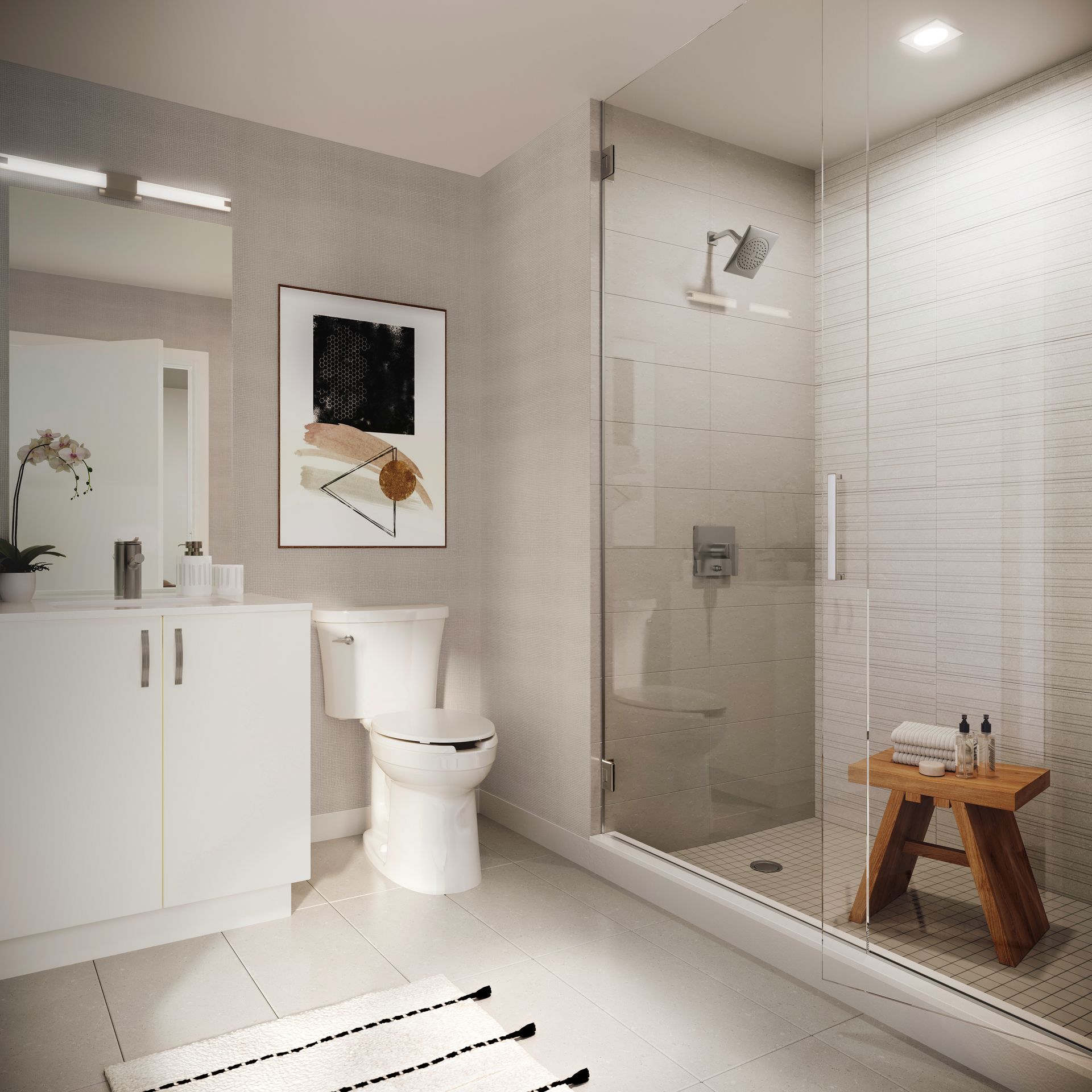 - Clear glass frameless shower, with mosaic floor tile, as per plan.
