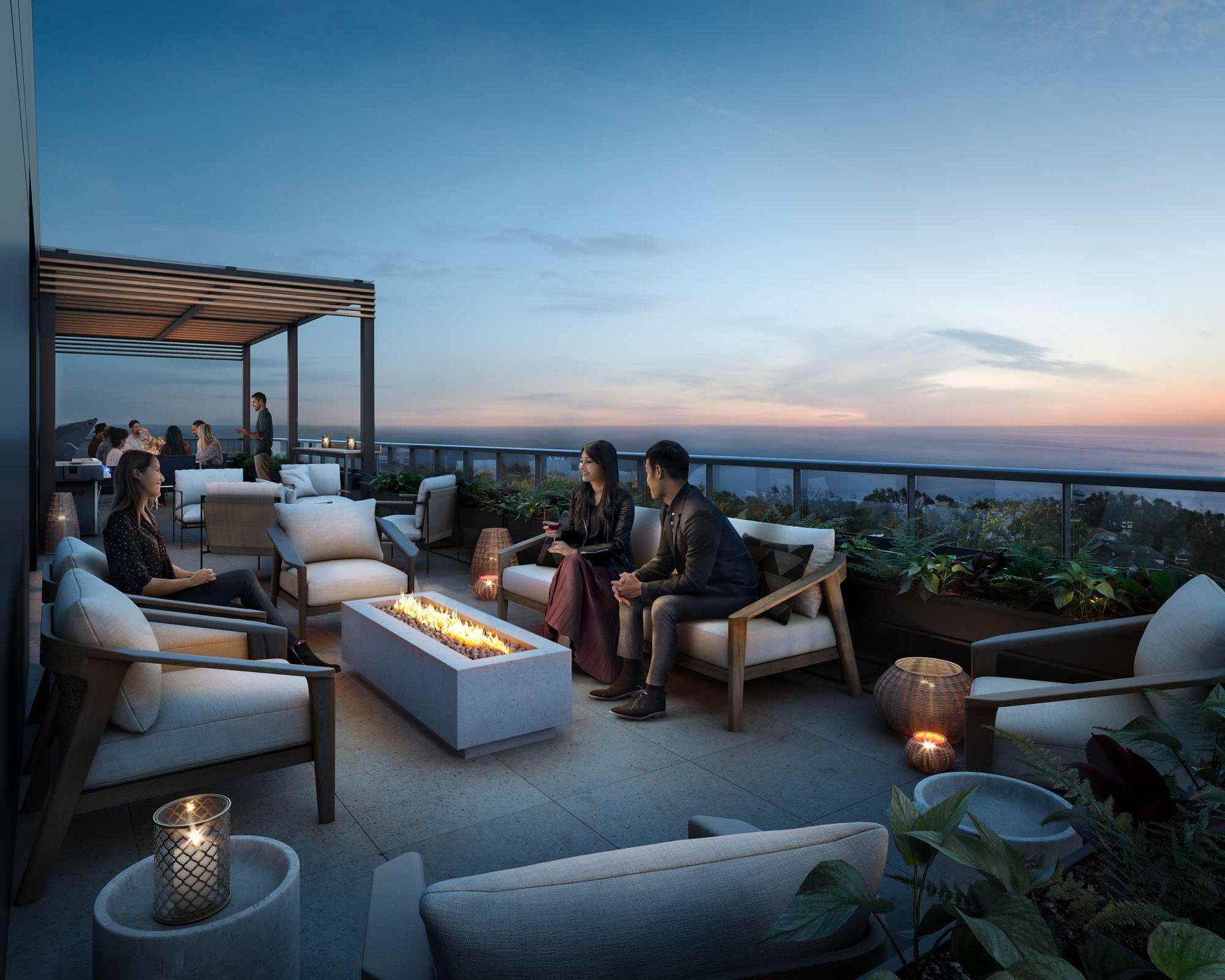 - Seventh floor lake view terrace with lounge, dining area and BBQ